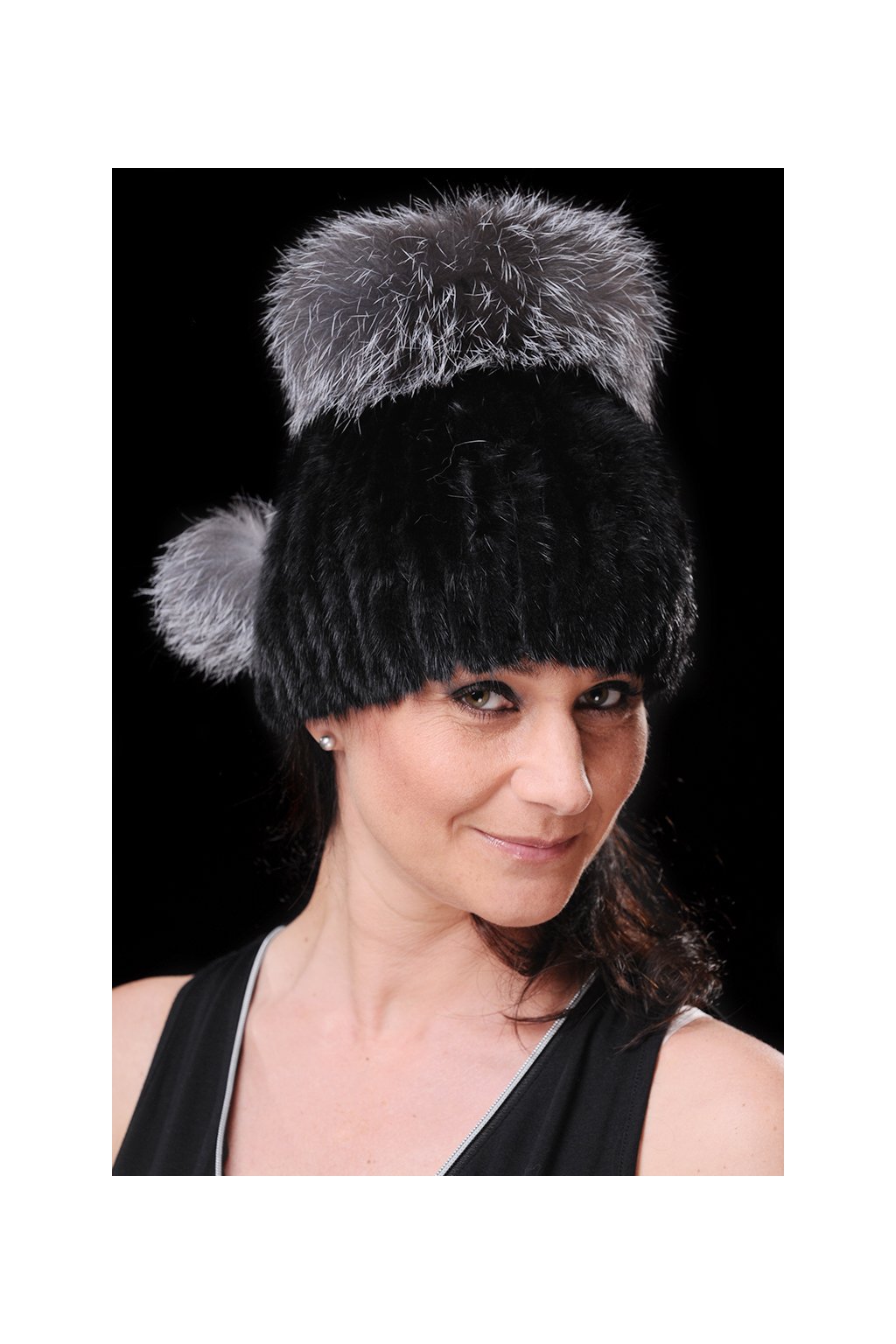 Luxusní, pružná, norková čepice s třemi bambulemi z liščí srsti.