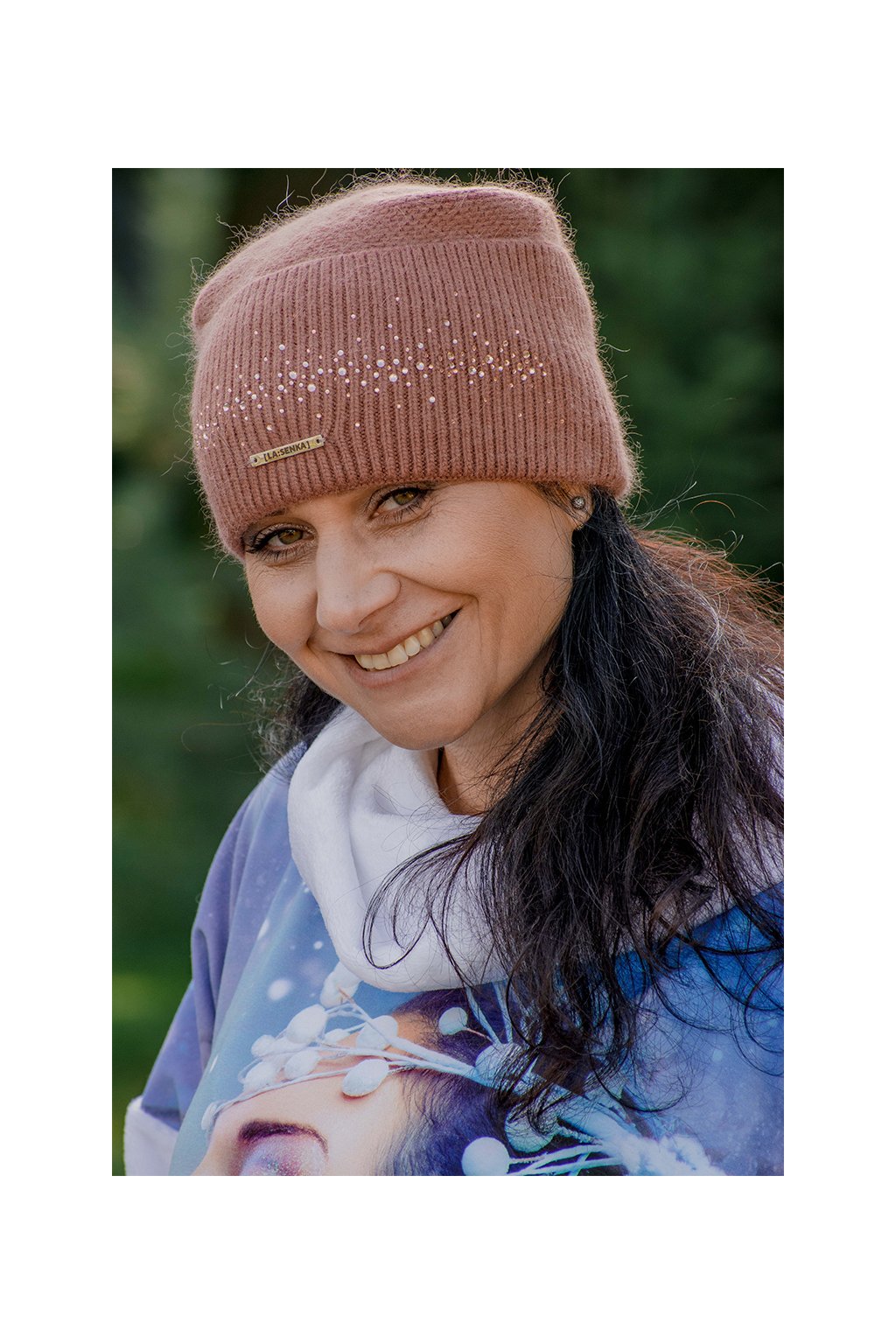 Hřejivá kvalitní čepice z vlny, kašmíru a moheru s malými zdobnými lesklými kamínky, značená malým plíškem s logem LA:SENKA.
