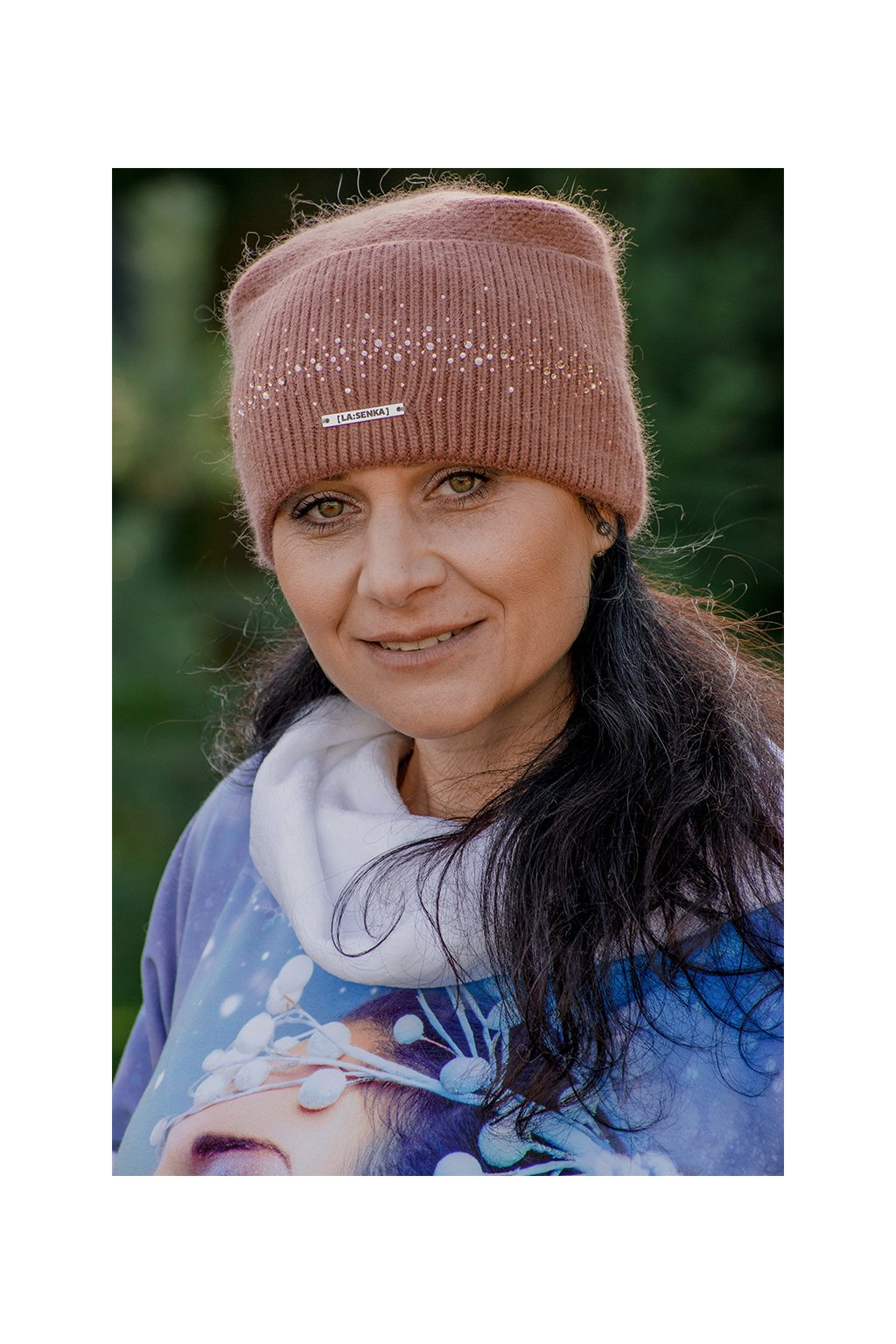 Hřejivá kvalitní čepice z vlny, kašmíru a moheru s malými zdobnými lesklými kamínky, značená malým plíškem s logem LA:SENKA.