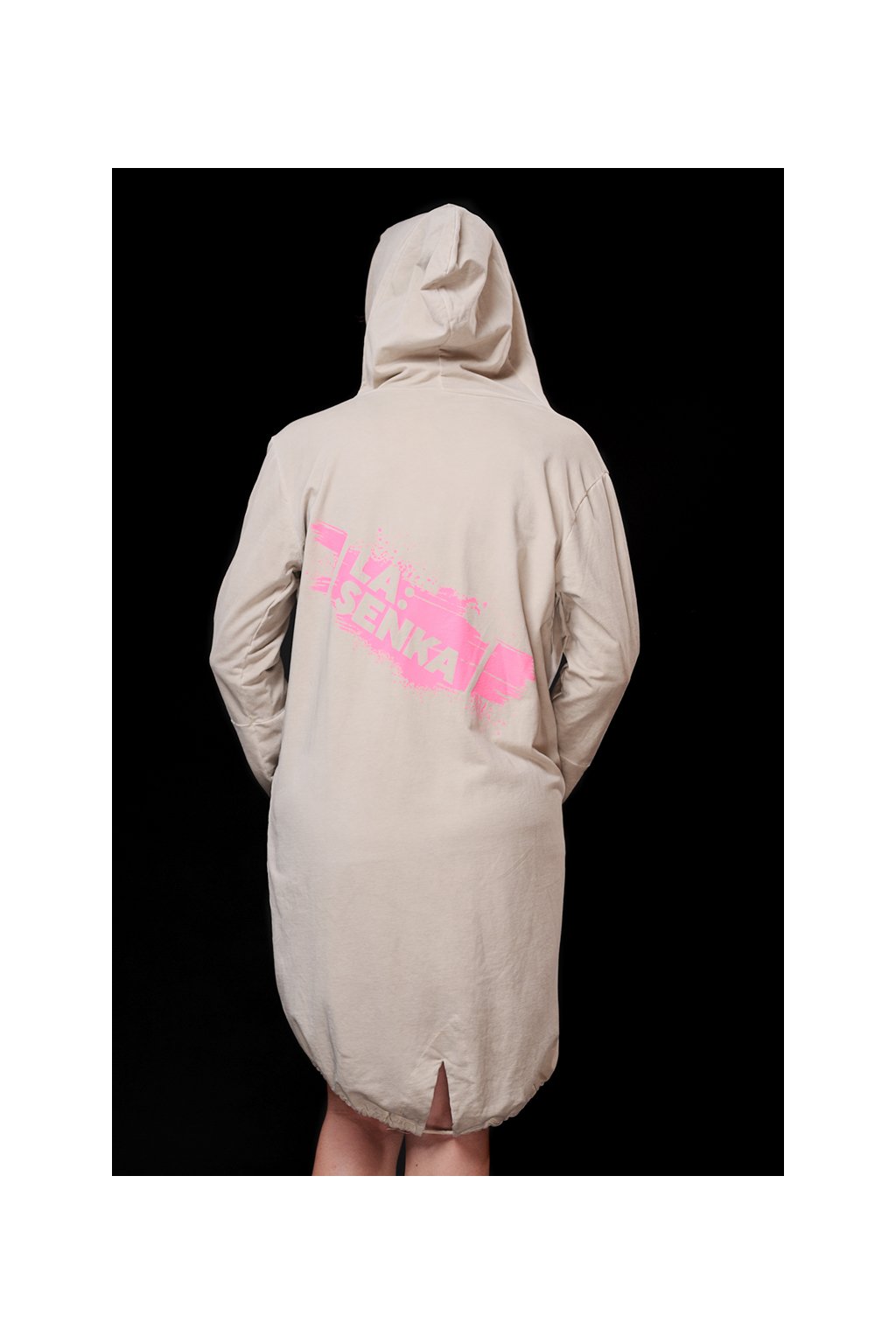 Pohodlný kardigan s dlouhými rukávy a potiskem na zádech, na kterých se dole nachází také rozparek. Kardigan má dvě kapsy, stahování ve spodní části na tkanici a kapuci, kterou využijete v nepříznivém počasí.