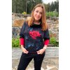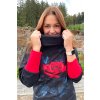 Lehká prodloužená černá mikina s nákrčníkem a dvoubarevným rukávem v dekoru rudé růže.