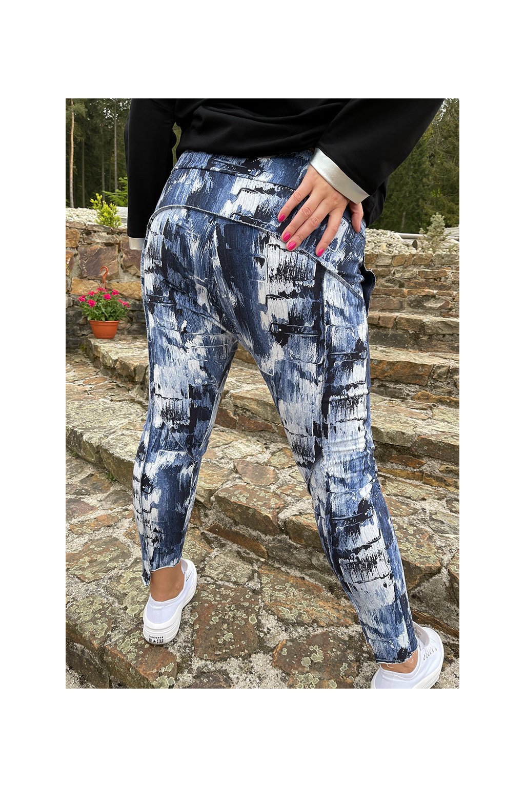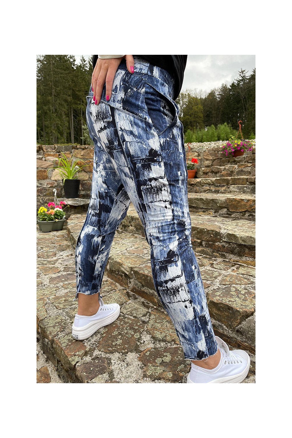 Dámské kalhoty s širším sedem v sytě modré abstraktní malbě.